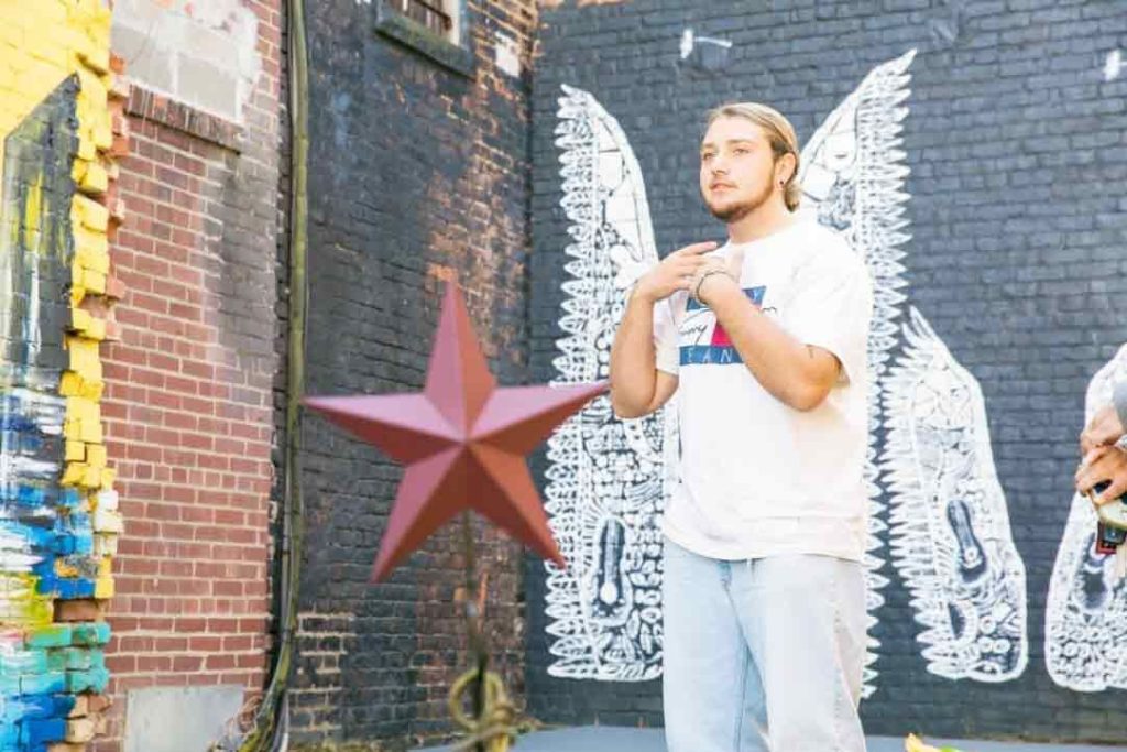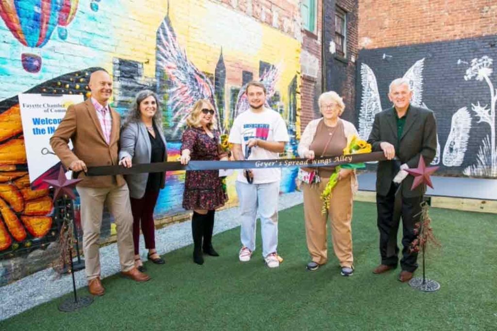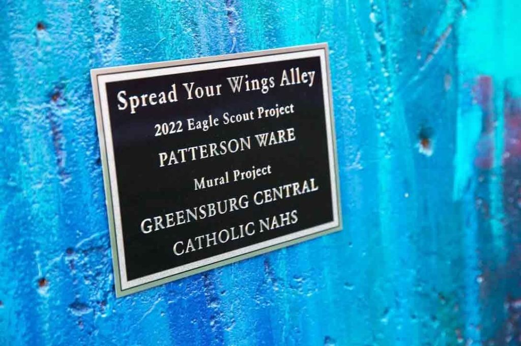 Patterson Ware of Scottdale stands amidst murals outside of the Geyer Performing Arts Center. Ware designed and executed an outdoor performance area as part of his Eagle Scout project.