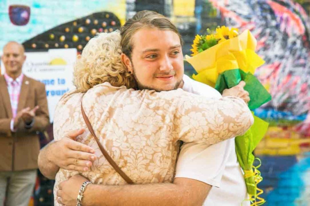 Patterson Ware of Scottdale hugs Laurie Watson at the dedication of an outdoor performance area at the Geyer Performing Arts Center in Scottdale. Ware designed and executed the space as his Eagle Scout project.