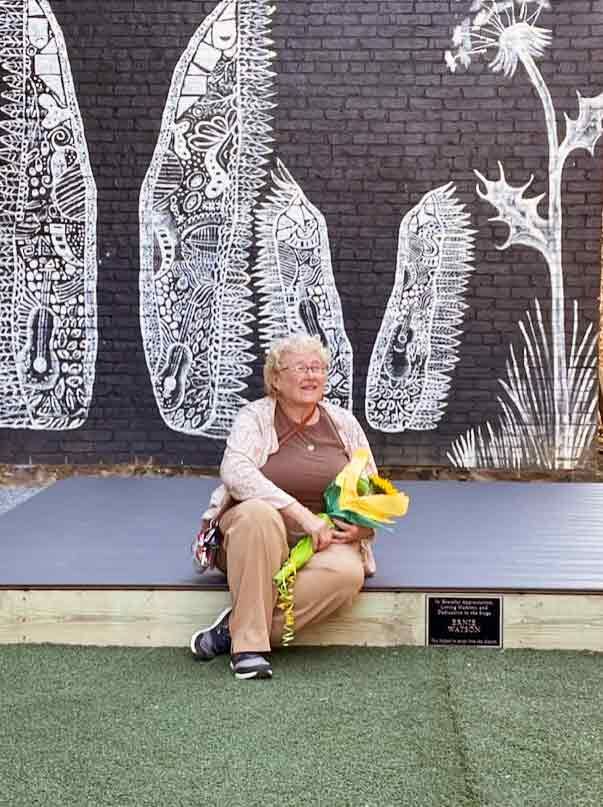 Laurie Watson sits on a stage dedicated to her husband, Ernie Watson, outside the Geyer Performing Arts Center in Scottdale.