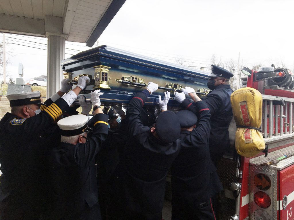 At his funeral service, his brother and sister firefighters placed his casket on one of the city fire engines for one last ride to his final resting place at Sylvan Heights Cemetery in Uniontown.