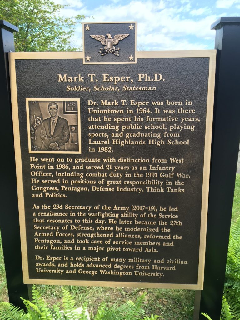 Officials unveiled a plaque at George C. Marshall Memorial Park in Uniontown dedicated to Esper during a small, private ceremony in the spring. Later in the day, Esper spoke at a dinner at the American Legion Post 51, and then acted as the grand marshal for Fayette CountyĢƵ 89th Americanism Day parade.
