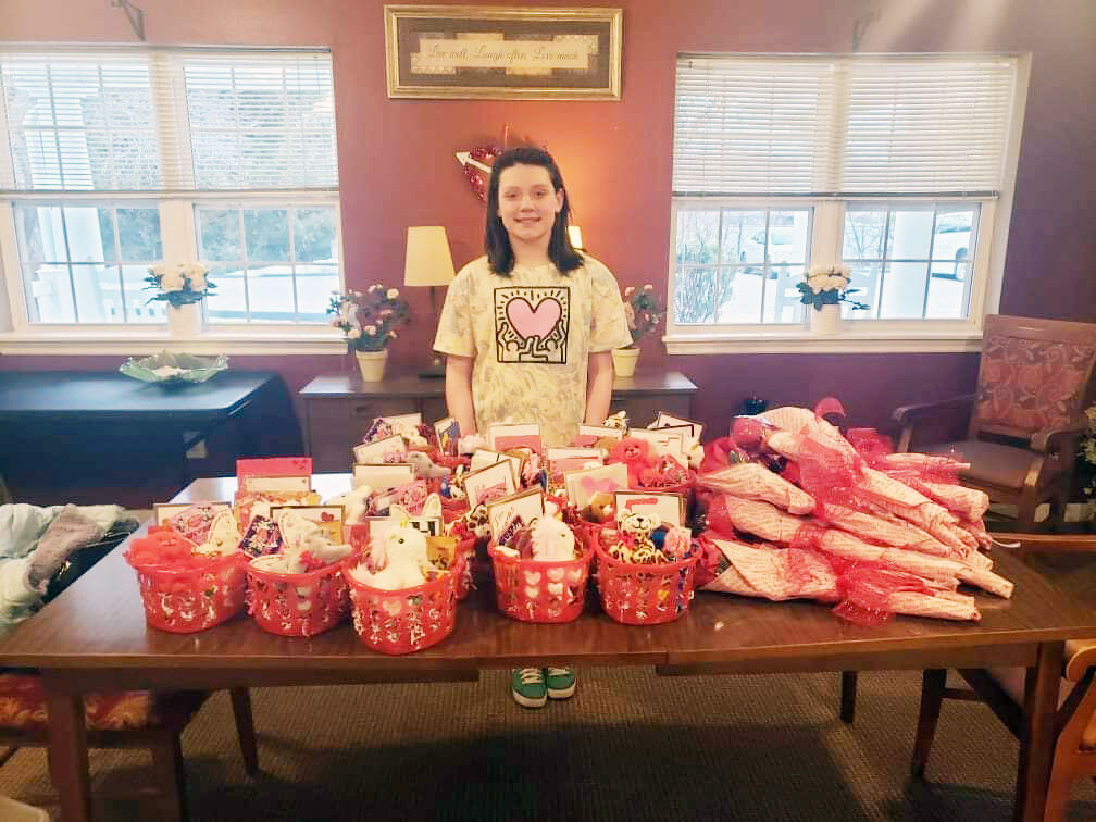 Hayden Hollowood, 11, made baskets of love and brought rose bouquets to the 20 residents of Marquis Garden Place in Uniontown. The young girl hand made cards, and used $160 in donations she collected to give each resident a box of chocolates, sugar-free candies, a stuffed animal, bubbles for bubble therapy, tissues, cookies, a wrapped rose bouquet and other treats.