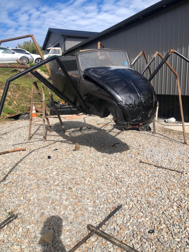 Using what material he had lying around his garage, Matthew fashioned eight legs out of pipe and welded them onto the hollowed-out chassis of the 1961 Volkswagen Beetle. During assembly, the legs sometimes had to be rebuilt, as they could not withstand the weight of the car.