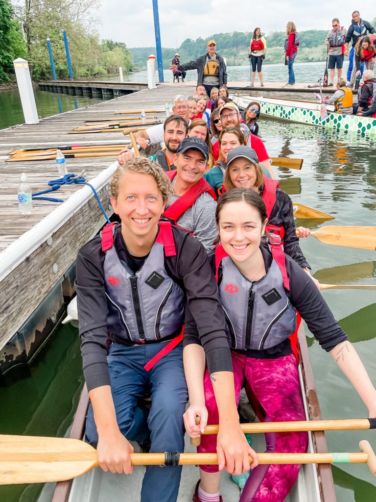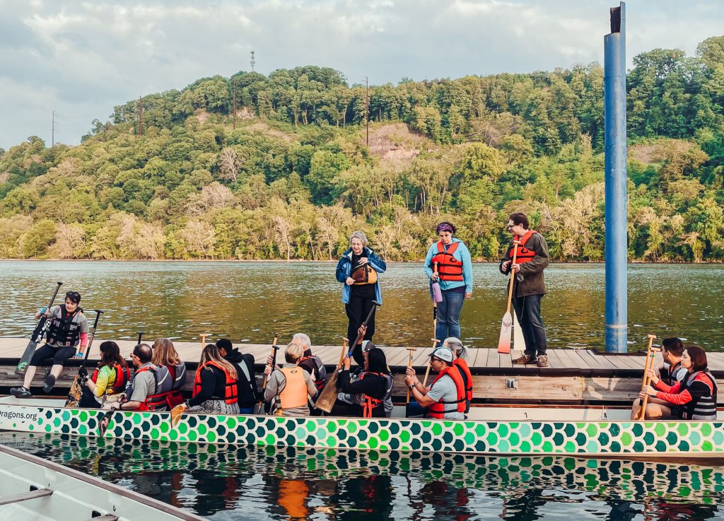 Part of the team-building – literally speaking – is outreach events like Date Night with a Dragon. On May 20, couples from Pittsburgh and surrounding areas gathered at the yacht club, where they were fitted for life jackets, taught how to “paddles up!” and row before hitting the water.