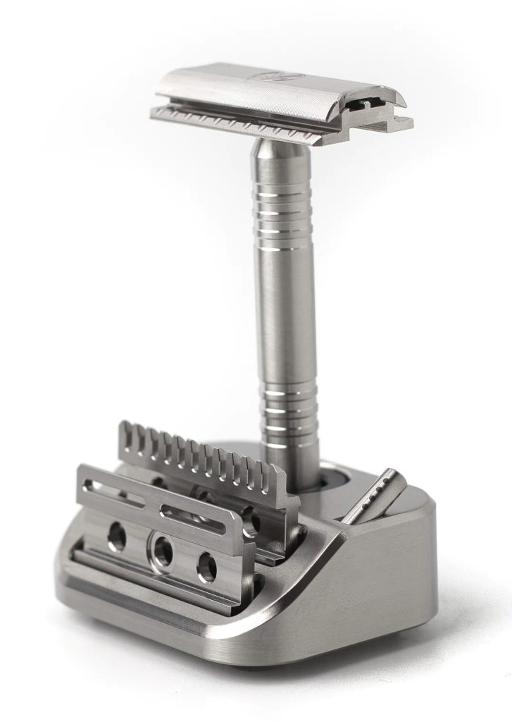 They sell the Model 921-M razor, the number coming from Sept. 21, the date on which the Yates’ sons, Landon and Lincoln, were born two years apart. They also make custom razors, and allow customers to choose if they want a top cap in stainless steel, brass or titanium, an engraving in the top cap and bead blast, stonewash and as-machined finishes.