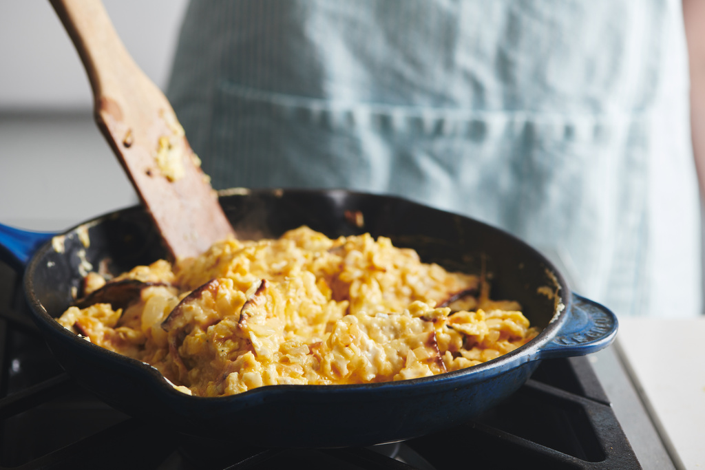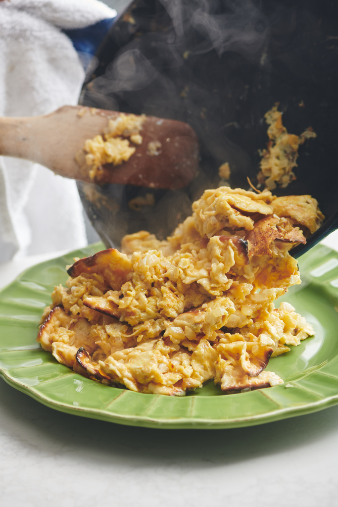 Brei means “fry” in contemporary Yiddish, and translates to “mash” or “porridge” in German. After adding the egg-and-matzo mixture to a skillet, some people let it cook until brown on the bottom, then kind of flip it, like a pancake. Or you can scramble the mixture, aiming for a kind of super-chunky, matzo-studded scrambled eggs.