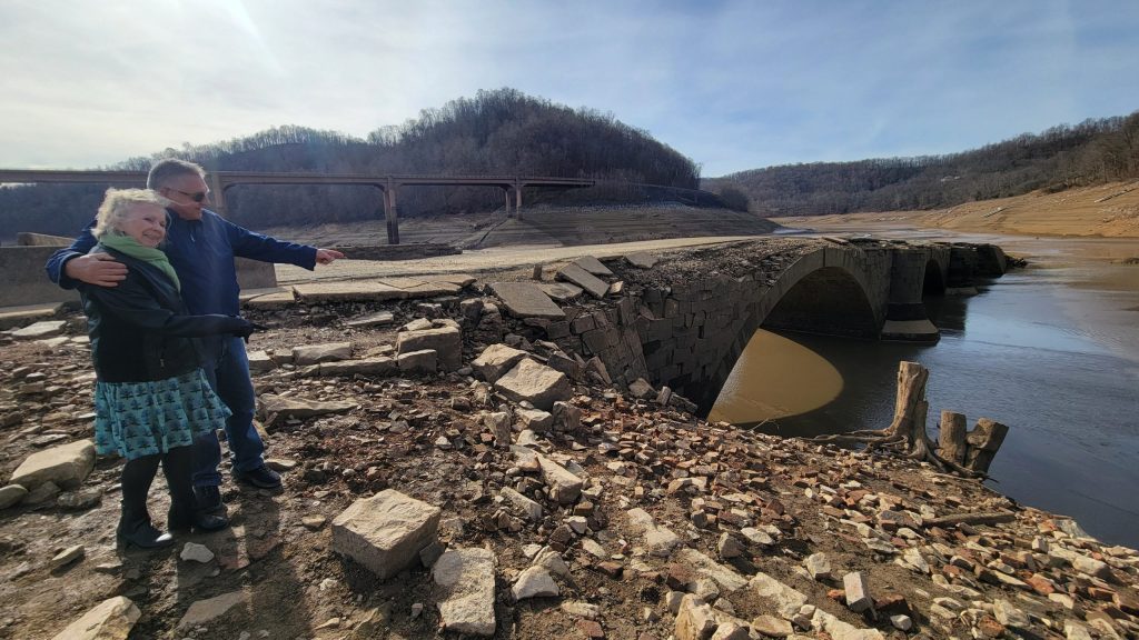 Dean and Dianne Ambrose traveled from their home in New Stanton on Wednesday afternoon and marveled at the unusual sight of the ghost bridge that is usually submerged under more than 50 feet of water during the summer months.