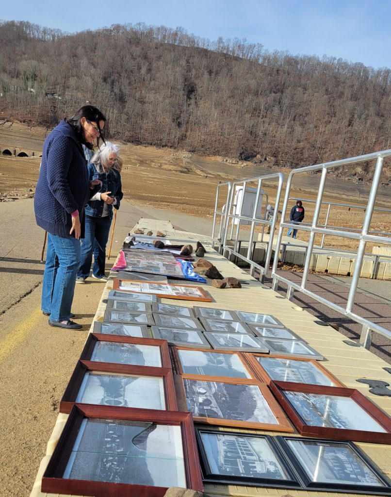 A few hundred yards away along the Somerfield boat ramp that leads to the bridge, old newspaper clippings and historical photographs were displayed so visitors could see what the town and bridge once looked like before they were flooded. Martha Nedley of Clarksville and Susie Gunchuck of Deemston hunched over admiring the pictures as they prepared to walk toward the bridge to see the relic for themselves.