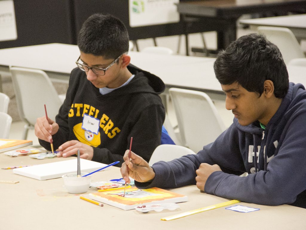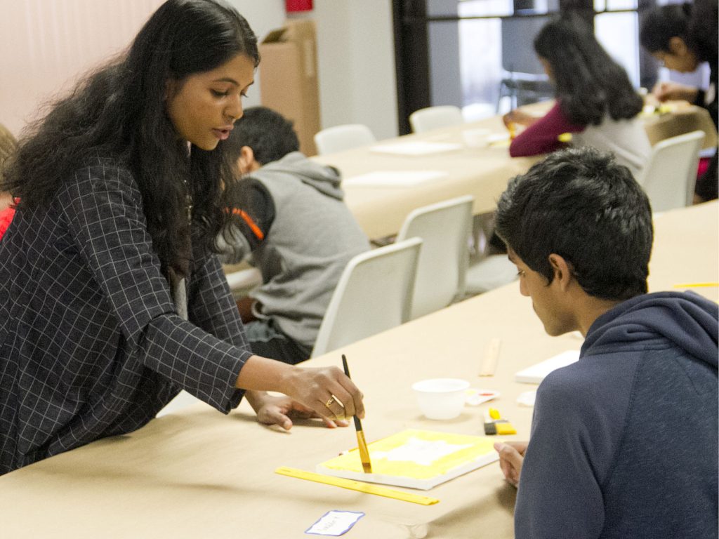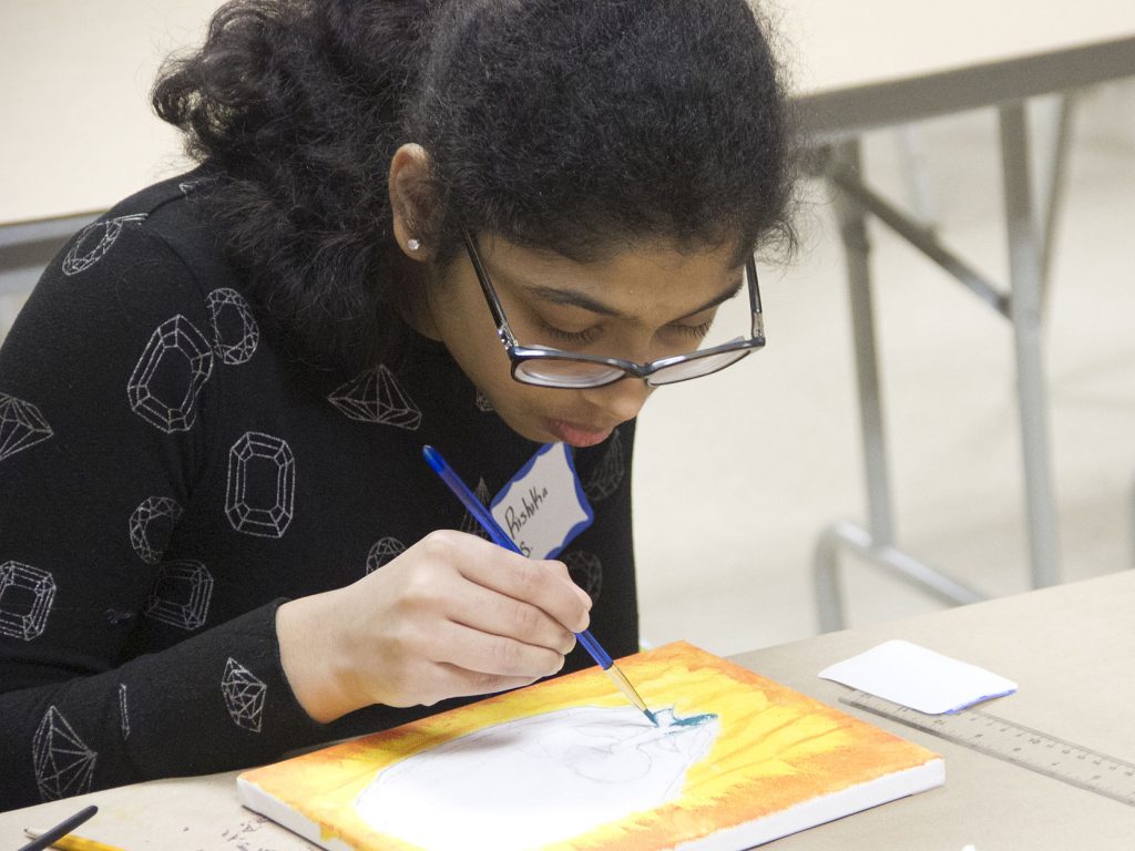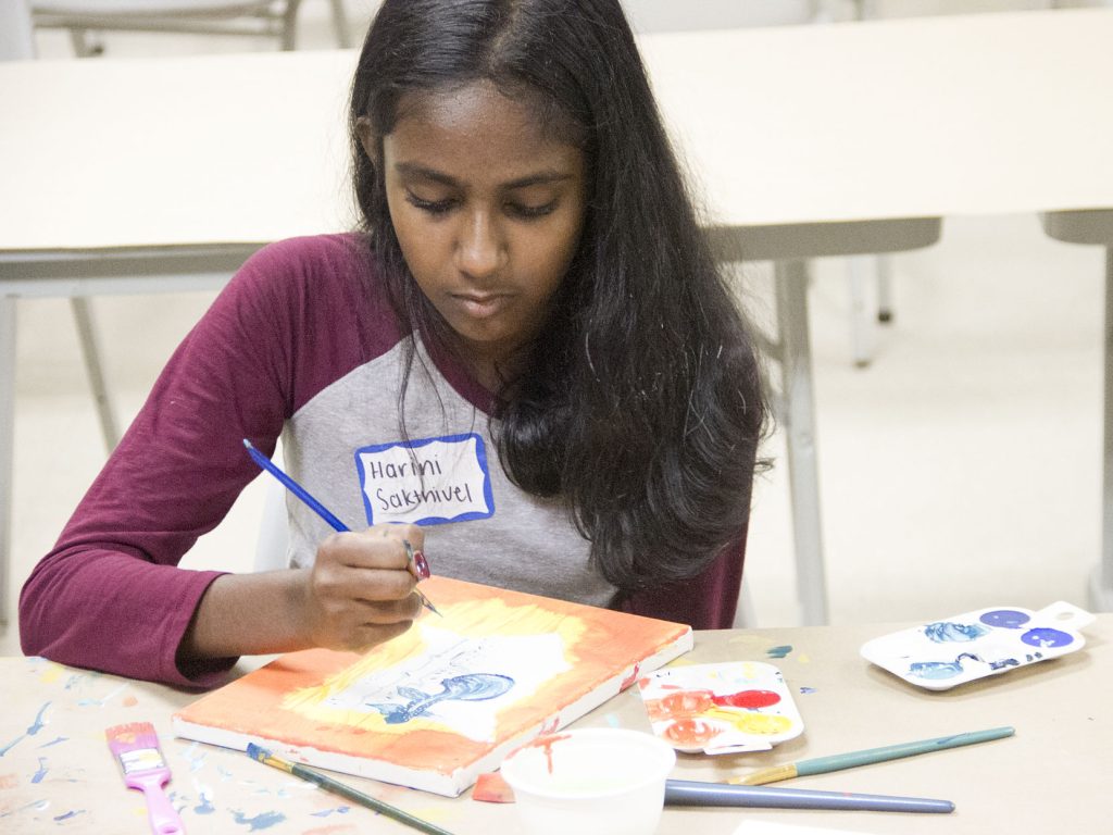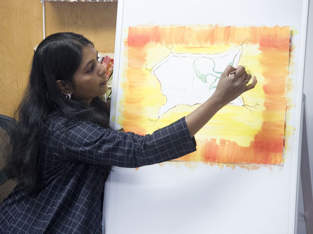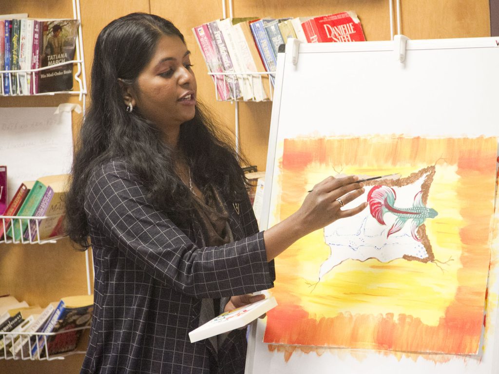 Selva Priya puts finishing touches on her painting during the class at South Fayette Township Library.