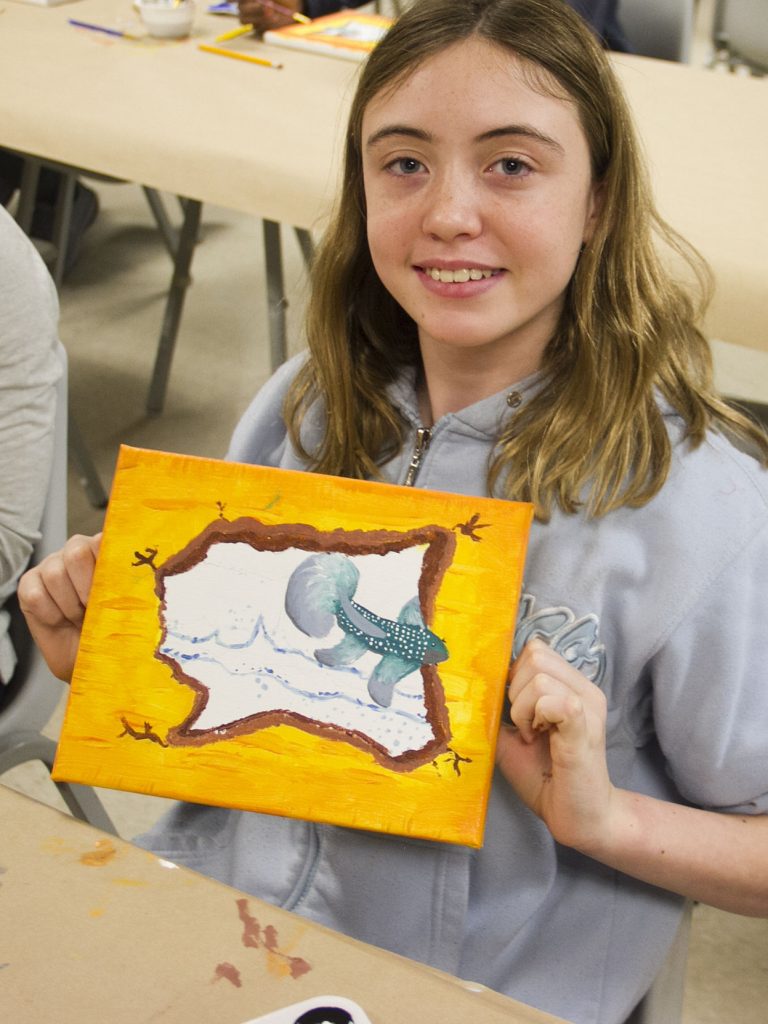 Amelia Keller displays her 3-D fish painting at the conclusion of Selva PriyaĢƵ class at South Fayette Township Library.