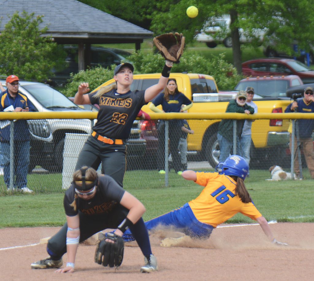 Carmichaels third baseman Shelbee McCann (10) ducks to avoid the throw to shortstop Natalie McNett (22), but it was not in time to stop West GreeneÄ¢¹½ÊÓÆµ McKenna Lampe (16) from stealing third during a Section 2-A game at Carmichaels High School, May 4, 2017. The Lady Pioneers won, 4-3. (Photo by John F. Brothers)