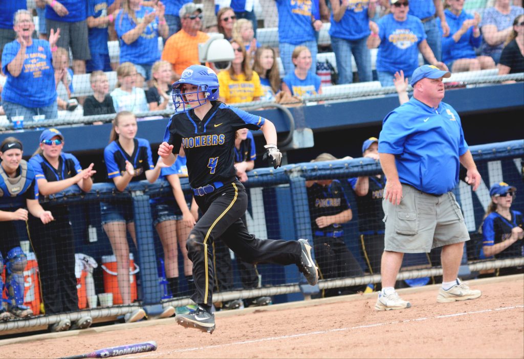 John F. Brothers | Ä¢¹½ÊÓÆµ West GreeneÄ¢¹½ÊÓÆµ Madison Lampe (4) races past coach Billy Simms toward home plate to score a run on an RBI single by Jade Renner in the fourth inning of the PIAA Class A softball championship game against Williams Valley, Friday, at Nittany Lion Softball Park in University Park. The Lady Pioneers rallied from a 7-0 deficit to win, 9-8.