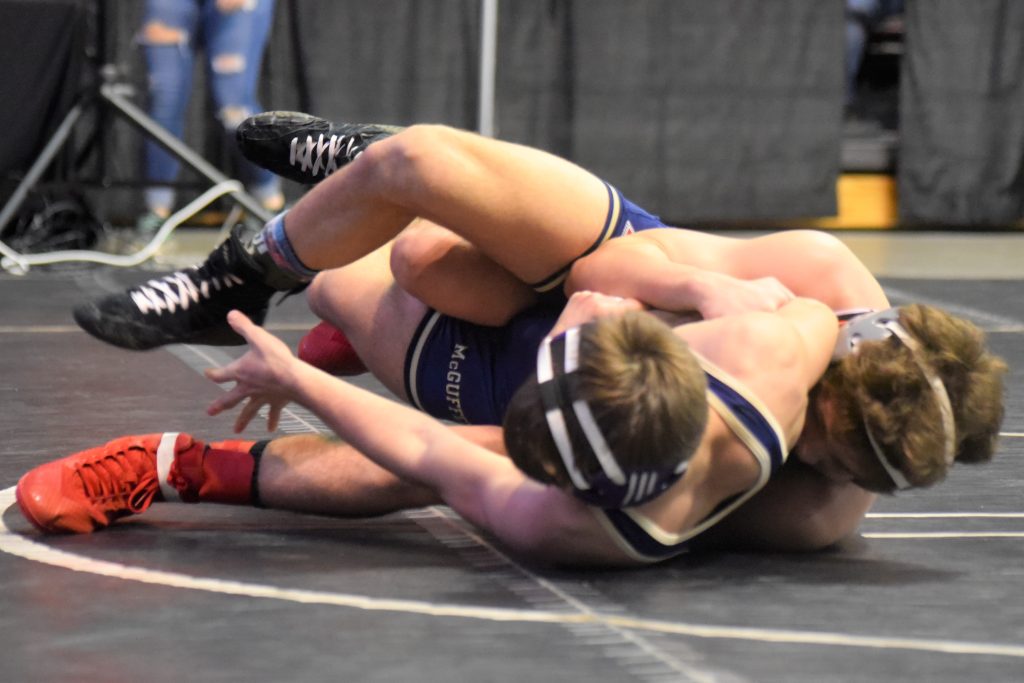 Jefferson-MorganĢƵ Gavin Teasdale works to finish off a takedown attempt against McGuffeyĢƵ Jett Pattison during their bout in the 126-pound weight class on Friday in the PIAA Class AA Southwest Regional Wrestling Championships at Indiana University of PennsylvaniaĢƵ Ed Fry Arena inside the Kovalchick Convention & Athletic Complex. Teasdale, a three-time state champion, won by a 19-4 technical fall to advance to the semifinals and secure a spot in the state tournament.