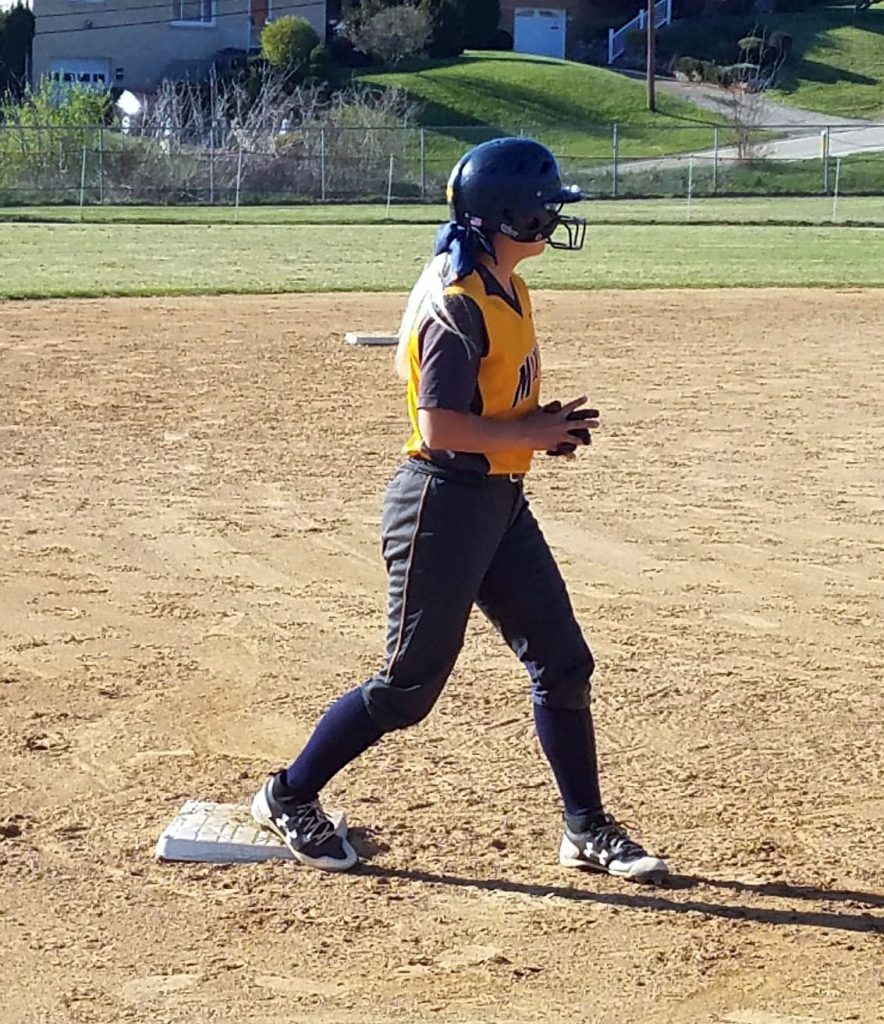 The switch-hitting senior stroked a single while batting right-handed into right that tipped off the glove of diving Monessen second baseman Destiny Habeck. Walker stole second and scampered to third when the throw rolled a short distance away. She then hustled home on a passed ball, sliding in with the gameĢƵ first run.