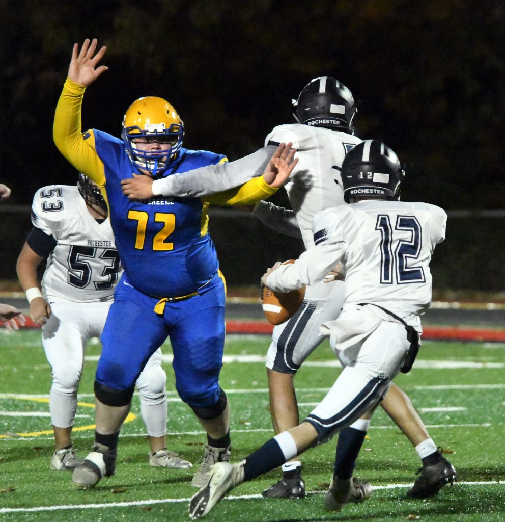 West Greene defensive lineman Brock Bedillion attemots to sack Rochester quarterback Zaine Jeffers during Friday night's game.