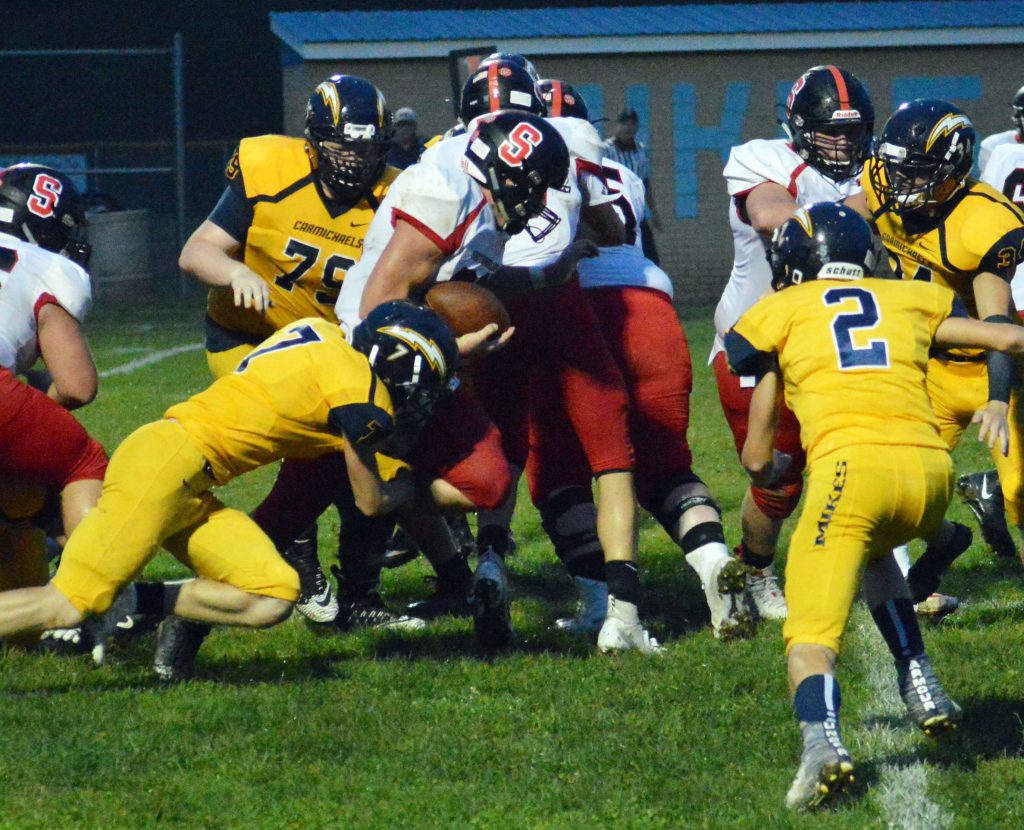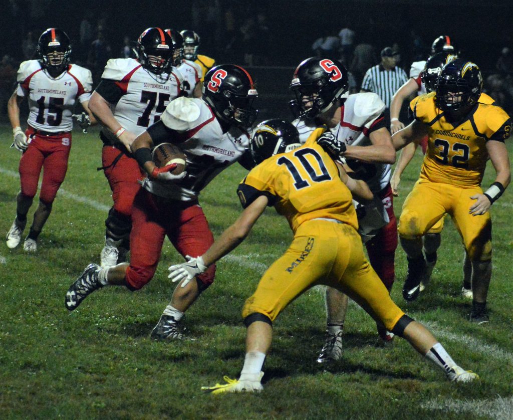 Southmoreland out-gained Carmichaels, 350 to 159, and had 17 first downs to 11 for the Mikes.