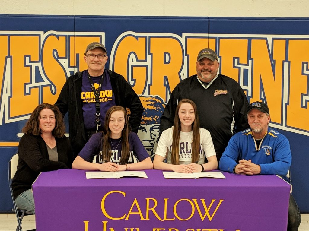 The twin sisters were at it again Monday afternoon at West Greene High School, as they both formally announced they will continue their academic and softball careers at Carlow University next fall.