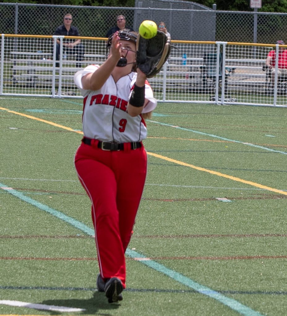 FrazierĢƵ Emi Curcio watches the ball go into her glove as she catches a pop up during a 2019 WPIAL Class AA quarterfinal playoff game against Vincentian Academy at Pleasant Valley Elementary School. Curcio has penned and circulated a petition directed to the PIAA to carefully consider the cancellation of the spring sports seasons. (Photo by Darnell Graham)