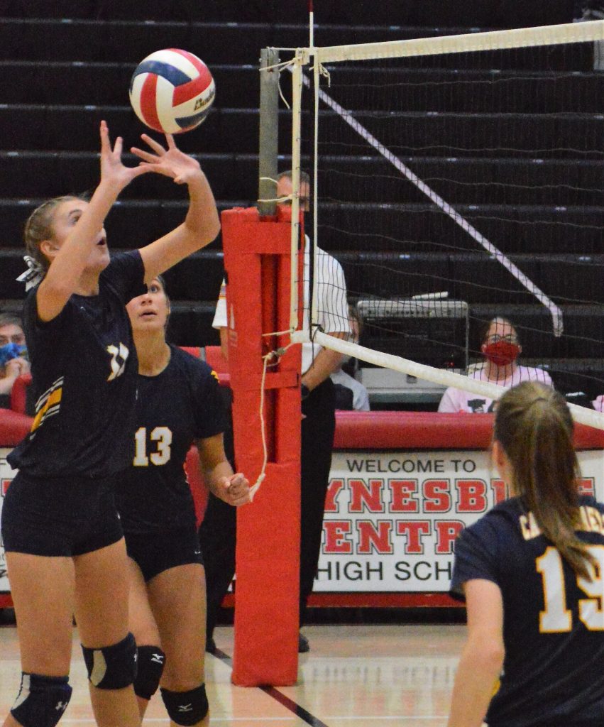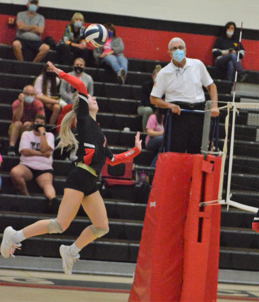 Carmichaels’ Emma Hyatt pushes the ball back over the net against Wayneburg Central during a Section 3-AA volleyball match in Waynesburg. Hyatt was selected to the All-Section first team. (Photo by Rob Burchianti)