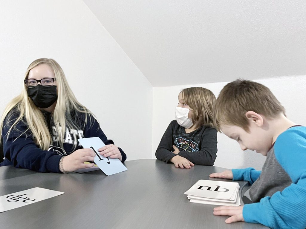 Two Waynesburg University student teachers are working on phonics flash cards with Carmichaels Area Elementary Center students, while fourth-grade teacher Jeff Donaldson helps other children complete homework.
