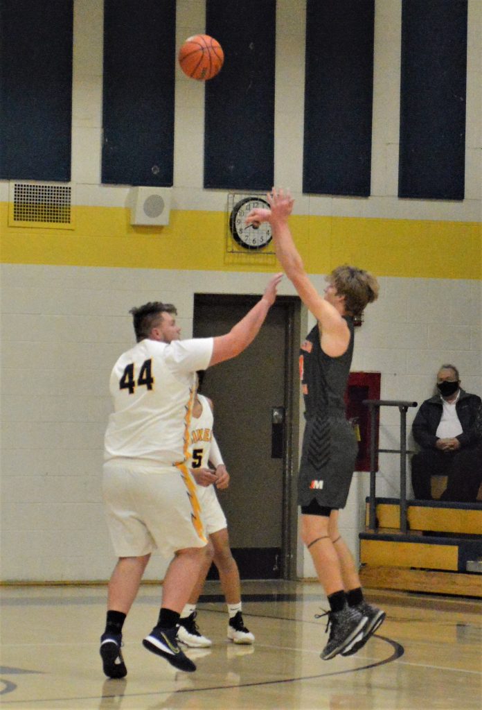 Carmichaels' Drake Lone shots a 3-pointer from the corner against Jefferson-Morgan during Friday night's game at Carmichaels. Long scored 18 points, including three 3-pointers, in the Mikes' 81-68 win.