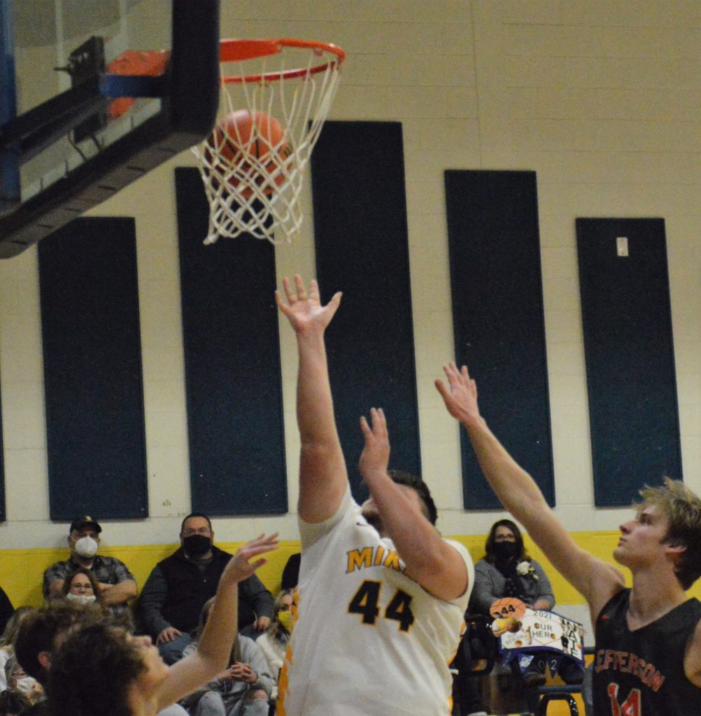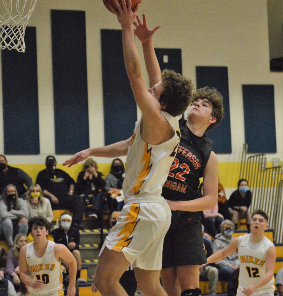 Jefferson-Morgan's Colt Fowler his a shot in the lane during Friday night's game at Carmichaels. Fowler scored 24 points but the Mikes won, 81-68.