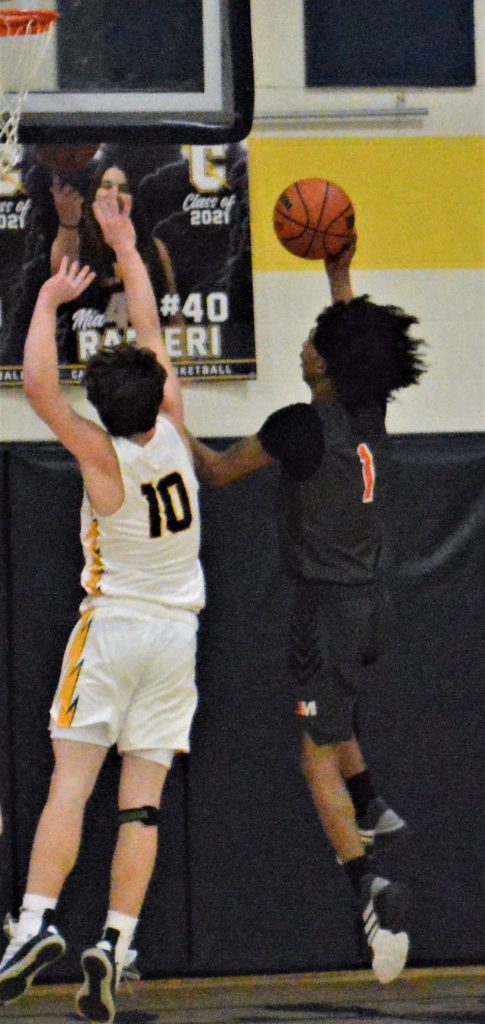 Carmichaels’ Michael Stewart puts up a shot while being defended by Jefferson-MorganĢƵ Troy Wright during agame at Carmichaels on Feb. 12. Stewart is a member of the Greene County Messenger All-County Boys Basketball first team. Wright was named honorable mention. (Photo by Rob Burchianti)