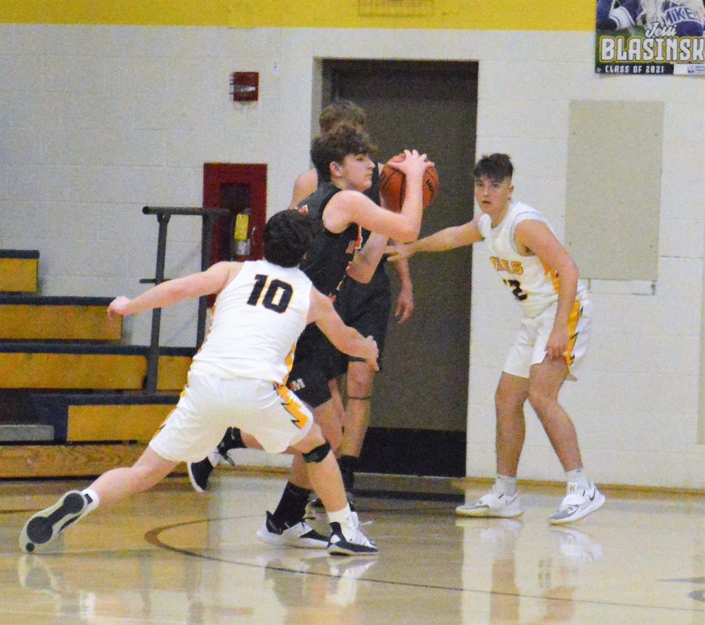 Jefferson-Morgan's Kijuan Paige (2) dribbles between Carmichaels' Tyler Richmond (5) and Dylan Rohrer (2) after making a steal in Friday night's game at Carmichaels.