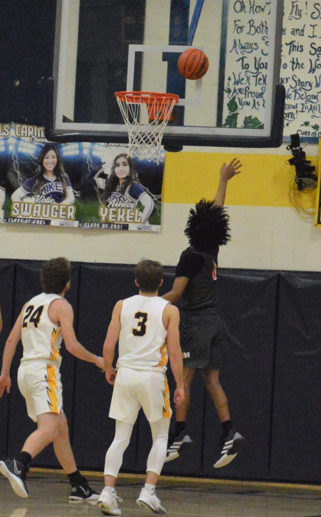 Jefferson-Morgan's Tahjere Jacobs puts in a layup during Friday night's game at Carmichaels. Jacobs scored 25 points but the Mikes won, 81-68.