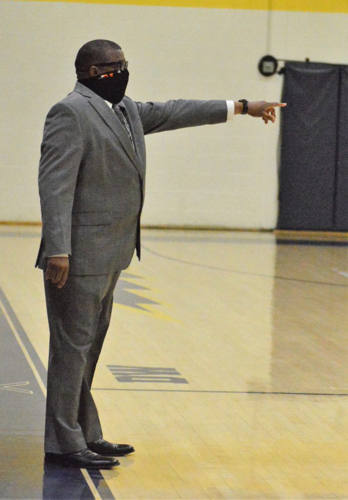 Jefferson-Morgan coach Dennis Garrett directs his team during Friday night's game at Carmichaels.