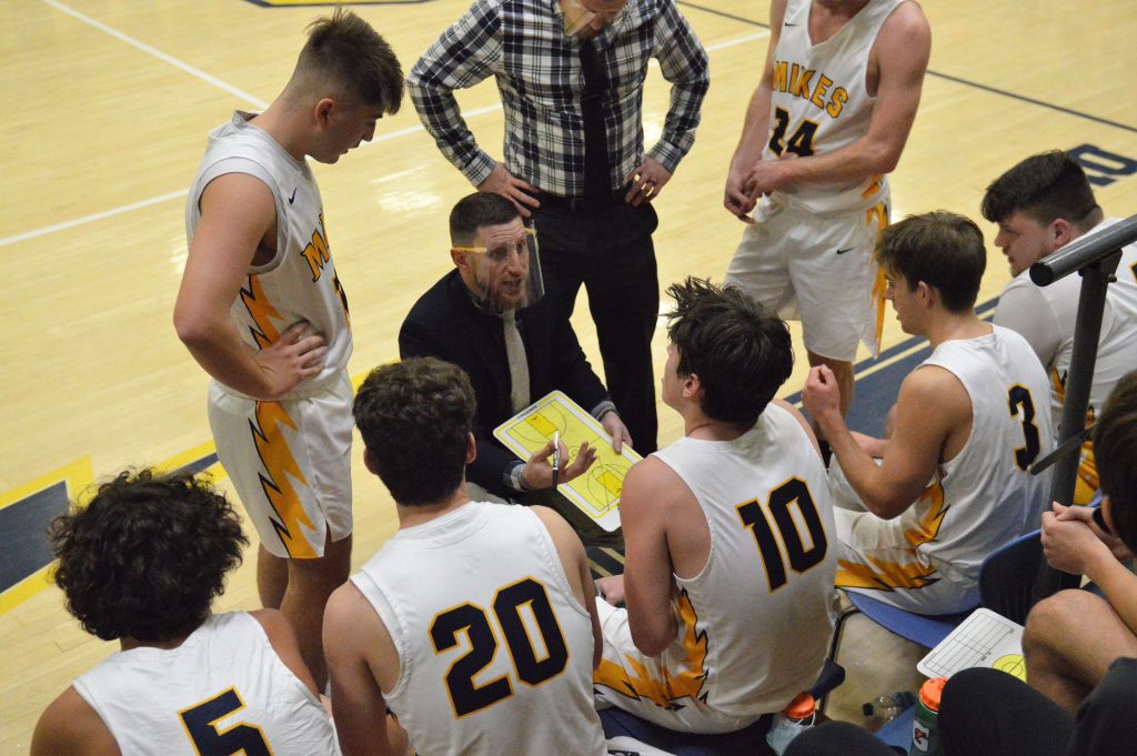 Carmichaels coach Ian McCombs talks to his players during a timeout in a game against Jefferson-Morgan on Feb. 12. McCombs is the Greene County Messenger Boys Basketball Coach of the Year. The Mikes’ Chris Barrish (3) is the Player of the Year, while teammates Drake Long (10) and Michael Stewart (24) join Barrish on the GCM All-County First Team. (Photo by Rob Burchianti)