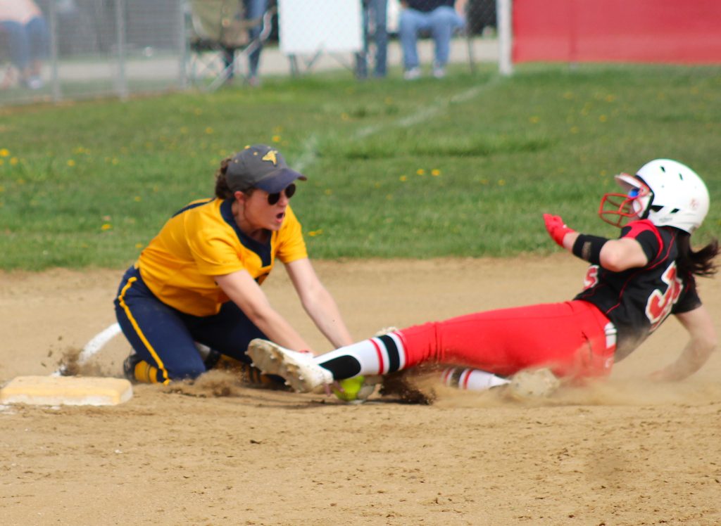 Carmichaels third baseman Grace Brown applies the tag for the out on FrazierĢƵ Maria Felsher in the bottom of the first inning in FridayĢƵ Section 3-AA game in Perryopolis. (Photo by Jim Downey)