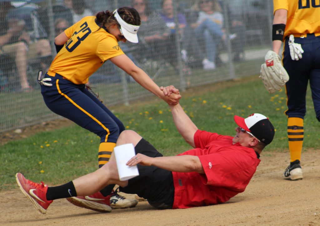 Carmichaels shortstop Kaitlyn Waggett (23) helps a smiling Frazier coach Don Hartman to his feet after Hartman lost his balance avoiding a foul ball in the bottom of the second inning of a Section 3-AA game in Perryopolis on April 22.