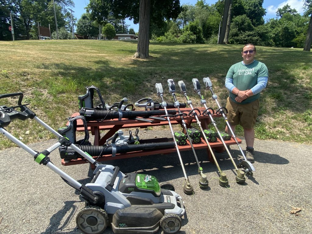 KilgoreĢƵ son, Oliver, has a lawn cutting business and is converting to electric mowers and equipment.