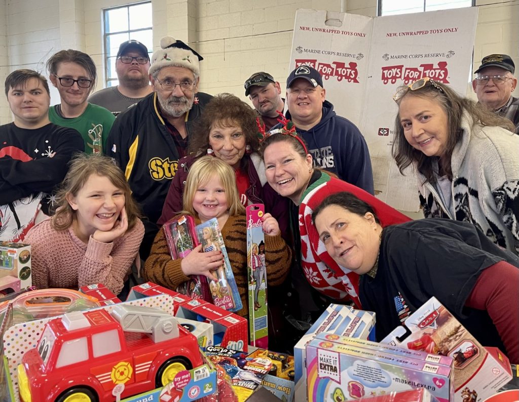 Ramona, Jessica and Pat Black leaned in. Jason and Blackie held up one of the Toys for Tots boxes that sat at 11 sites in and around Waynesburg this year gathering toys. Right up front, Lily and Faith showed the face of childhood when thereĢƵ presents to be had.