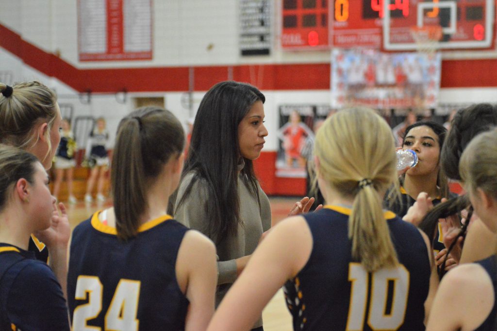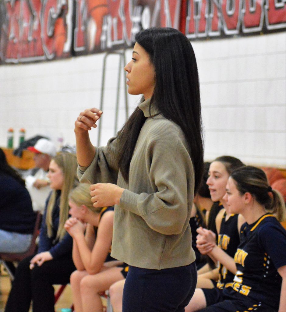 Carmichaels coach Chelsea Ulery motions to her players during Friday nightĢƵ playoff game against Frazier at Henry DiVirgilio Field House. (Photo by Rob Burchianti)