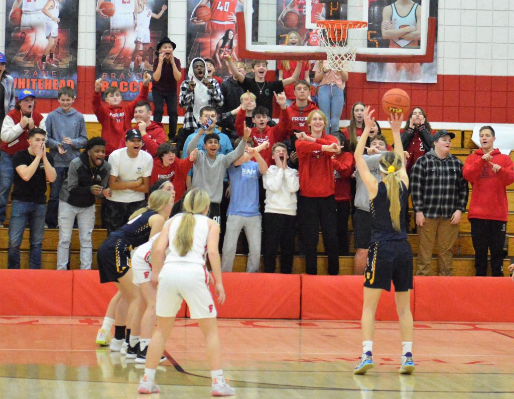 FrazierĢƵ student section tries to distract Carmichaels’ Sophia Zalar as she shoots a free throw during the fourth quarter of Friday nightĢƵ playoff game at Henry DiVirgilio Field House. (Photo by Rob Burchianti)