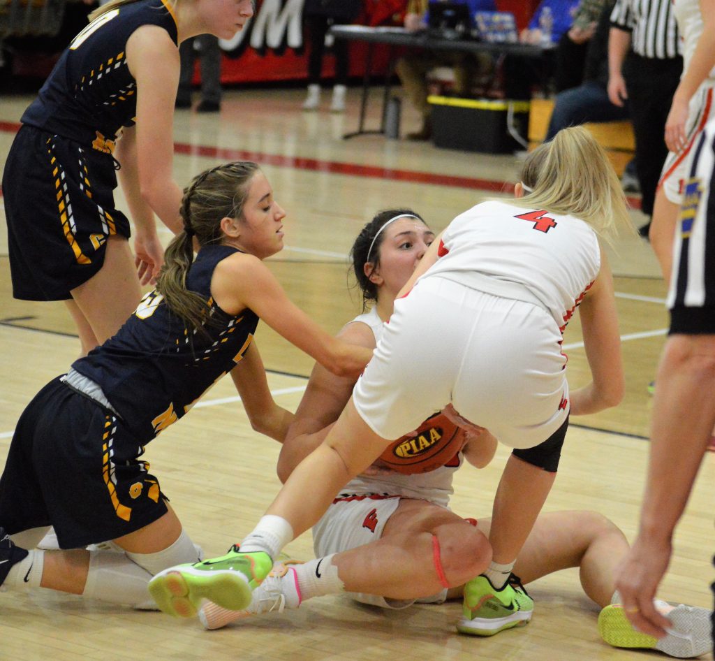 Carmichaels’ Ashton Batis (left) battles FrazierĢƵ Eliza Newcomer and Addison Day (4) for a loose ball during Friday nightĢƵ playoff game at Henry DiVirgilio Field House.
