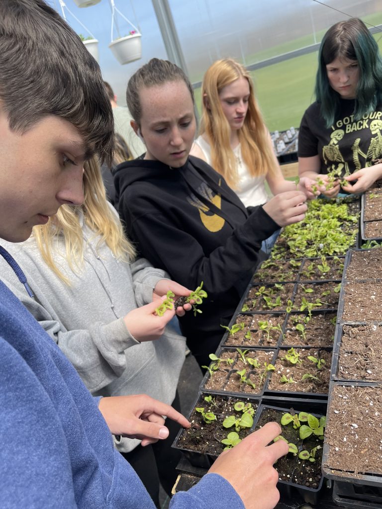 With restrictions still lingering in 2021, the greenhouse stayed closed but each student got a six-foot space and a hanging basket to grow for personal use. Rural King in Washington donated the seeds.