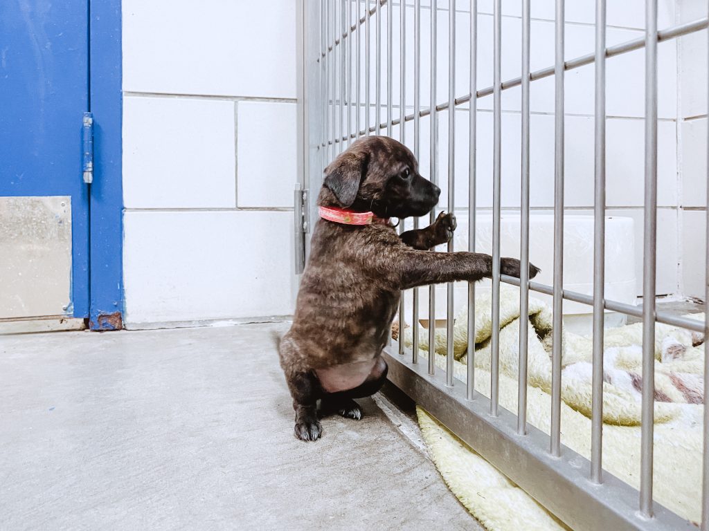 A litter of 7-week-old puppies – brindled females named Petunia, Piper, Pippy and one boy, a black pup called Pluto – are rambunctious with one another and thirsty for the limelight. When Cagle lets them out of their crate, the siblings zip around the room, stopping at other kennels to greet their older sibs and engage with humane society employees.