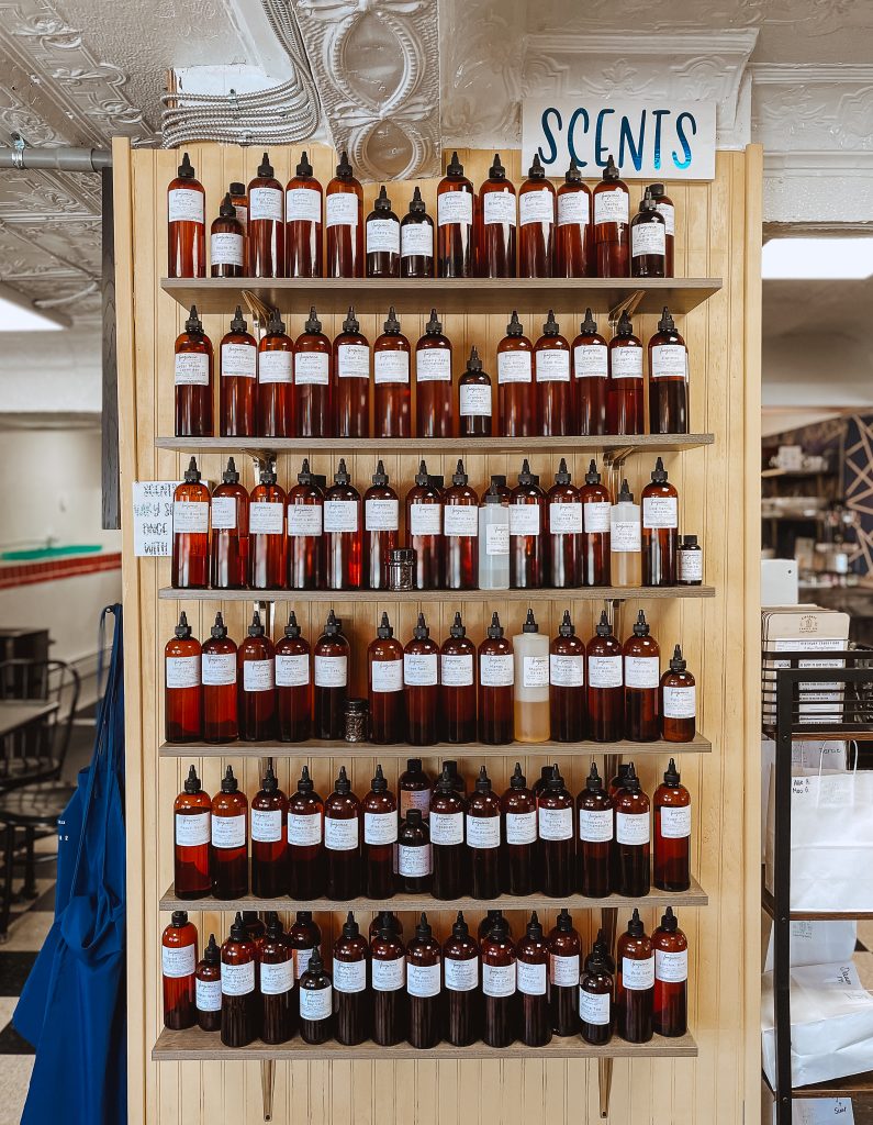 Glam, indeed. The Edison light fixtures, marble countertop and wispy floral arrangements offer guests a relaxed, creative atmosphere. Already, Eddy has welcomed return customers, and she loves guiding first-time visitors through the scent-making process.