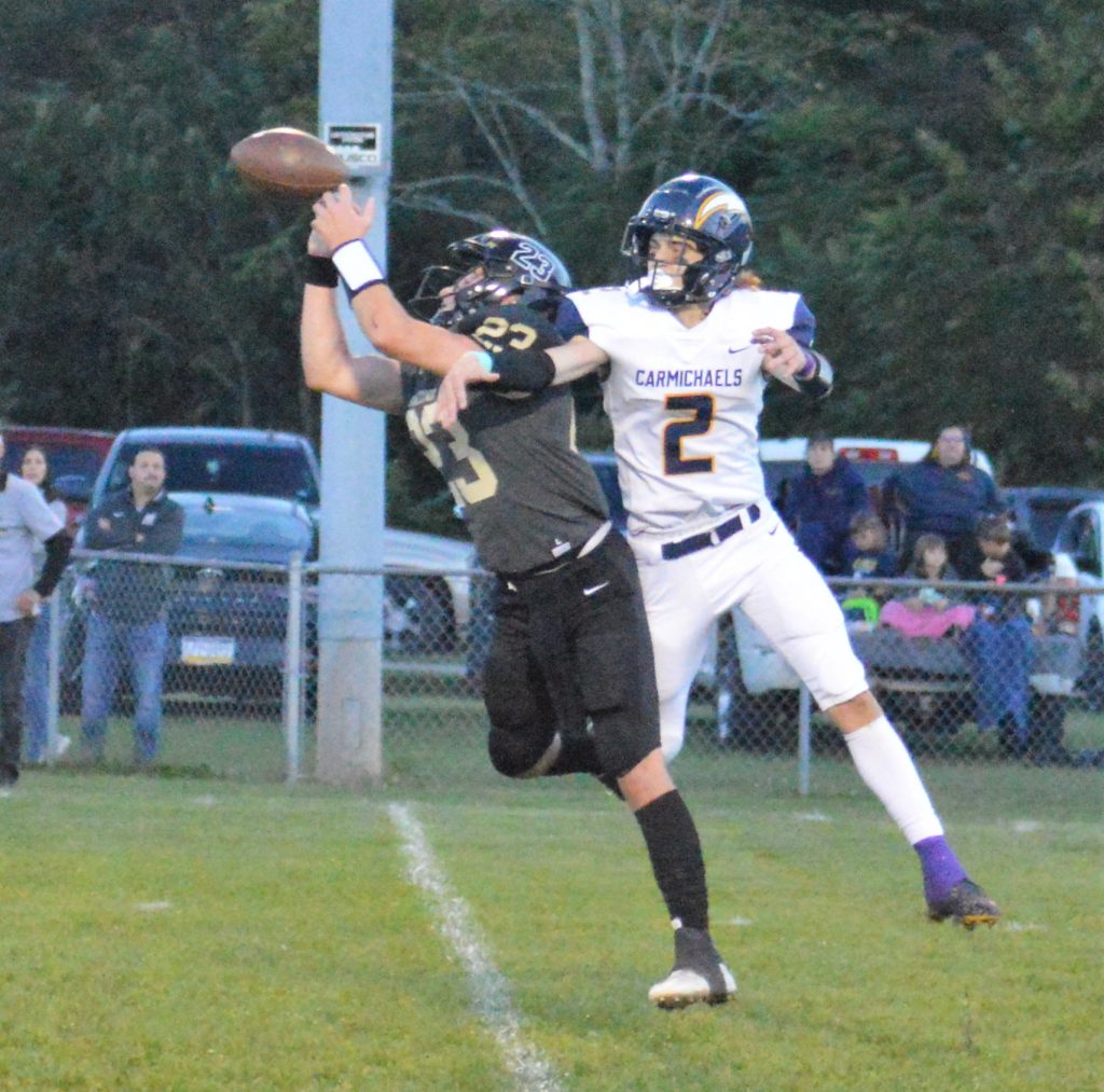 Mapletown's Brody Evans (22) breaks up a pass intended for Carmichaels' Cannon Bupka (2) during Friday night's game at Mapletown.