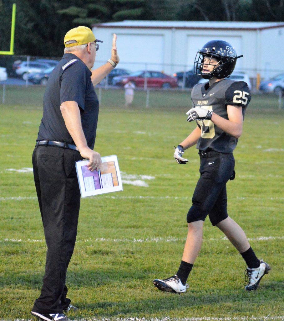 Mapletown coach George Messich greets Josh Howard with a high five as he comes off the field during Friday night's game against Carmichaels at Mapletown.