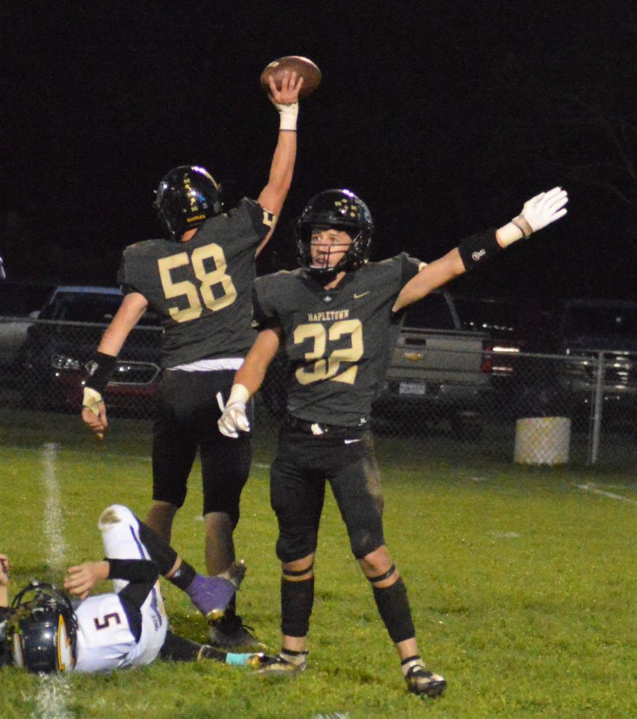 MapletownĢƵ Brock Evans (32) signals its the Maples ball as Levi Howard (58) celebrates after recovering a Carmichaels fumble during Friday nightĢƵ game at Mapletown. (Photo by Rob Burchianti)