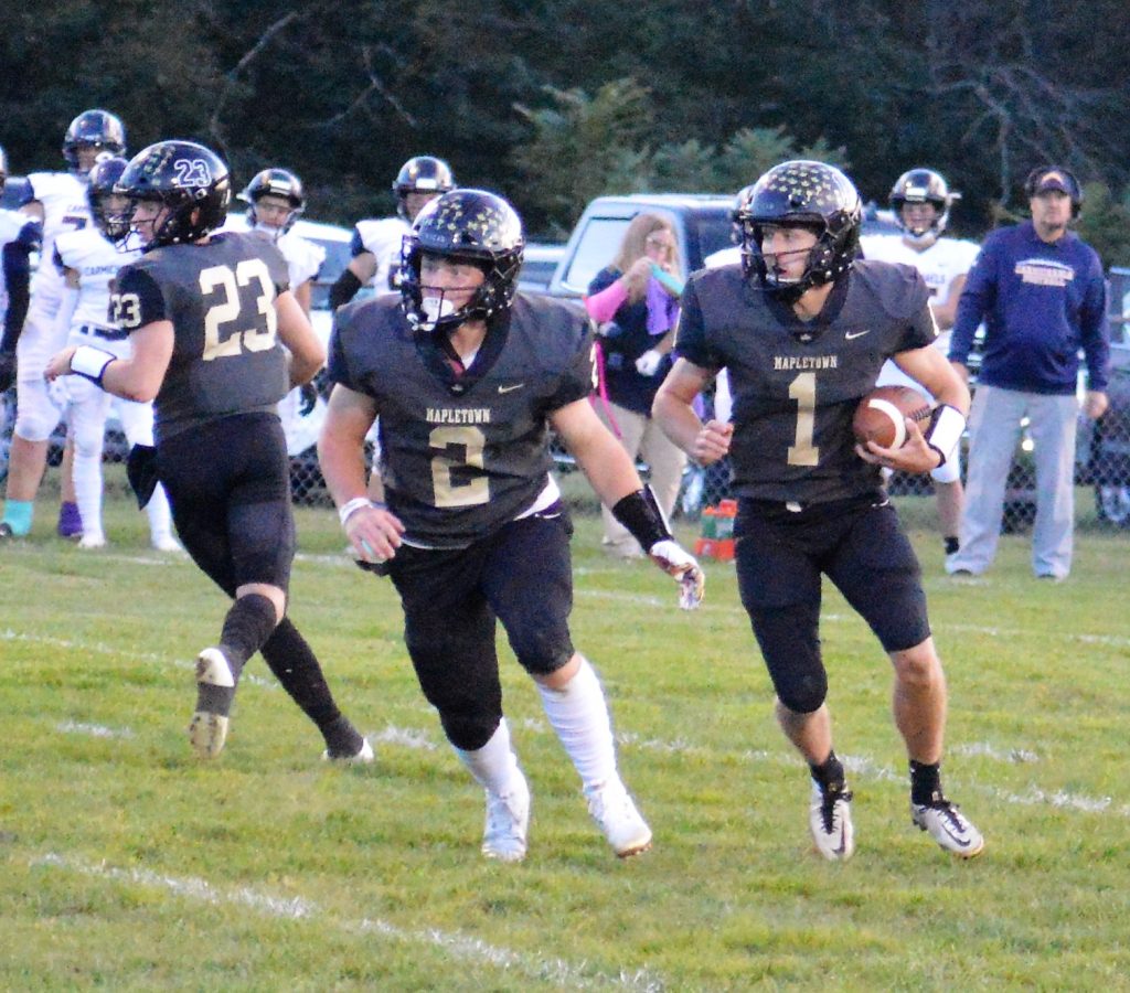 Mapletown's Landan Stevenson (1) follows the blocking A.J. Vanata (2) after taking a handoff from Brody Evans (23) during Friday night's game against Carmichaels at Mapletown.