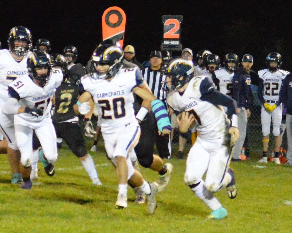 Carmichaels' Alec Anderson (7) follows the blocking of Peyton Schooley (20) during a running play in Friday night's game at Mapletown.