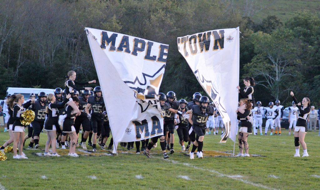 Evan Griffin (30) leads Mapletown onto the field before the start of its game against Carmichaels on Sept. 23. The Maples remain unbeaten at 5-0 after winning at California, 52-20, last Friday night. (Photo by Rob Burchianti)
