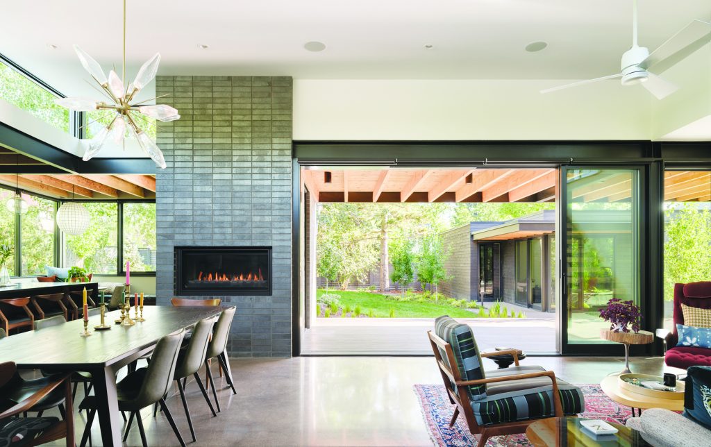 This season, designers are creating inviting, comfortable and serene spaces with modern vibes through the use of clean lines in design, materials and furnishings. One trick is integrating elements that transfer light or give an illusion of illumination from a higher sheen, such as glass brick. The play of light and shadows simultaneously blends inspiration from nature with sleek lines and dramatic focal points to evoke a sense of balanced calm and strength. This approach can also come to life through ceiling windows, furnishings and the use of stone, brick and wood on statement walls or accents.