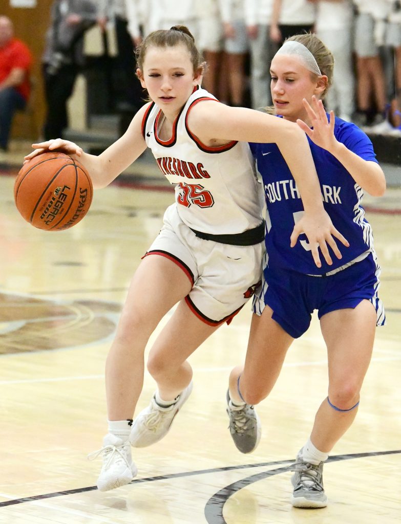 The Eagles’ Emily Mihelcic was clutch down the stretch at the foul line, as she was 4-of-4 in the fourth quarter. South Park was 7-of-10 at the line in the final frame.