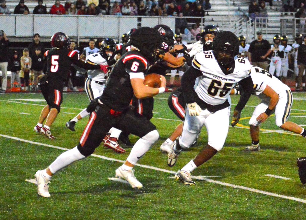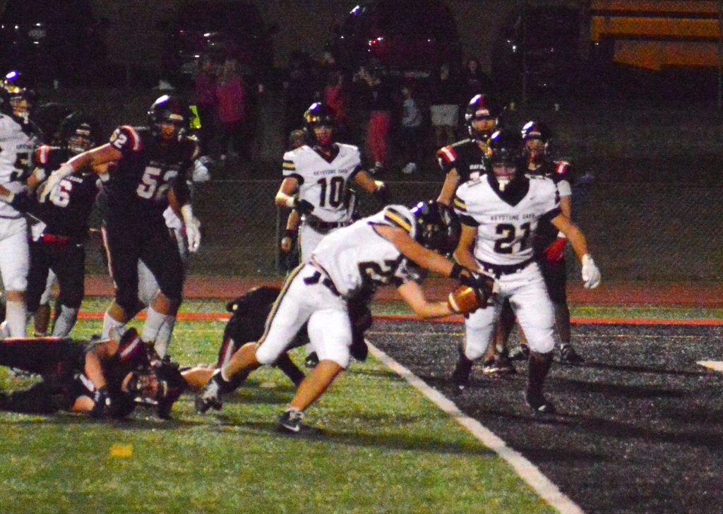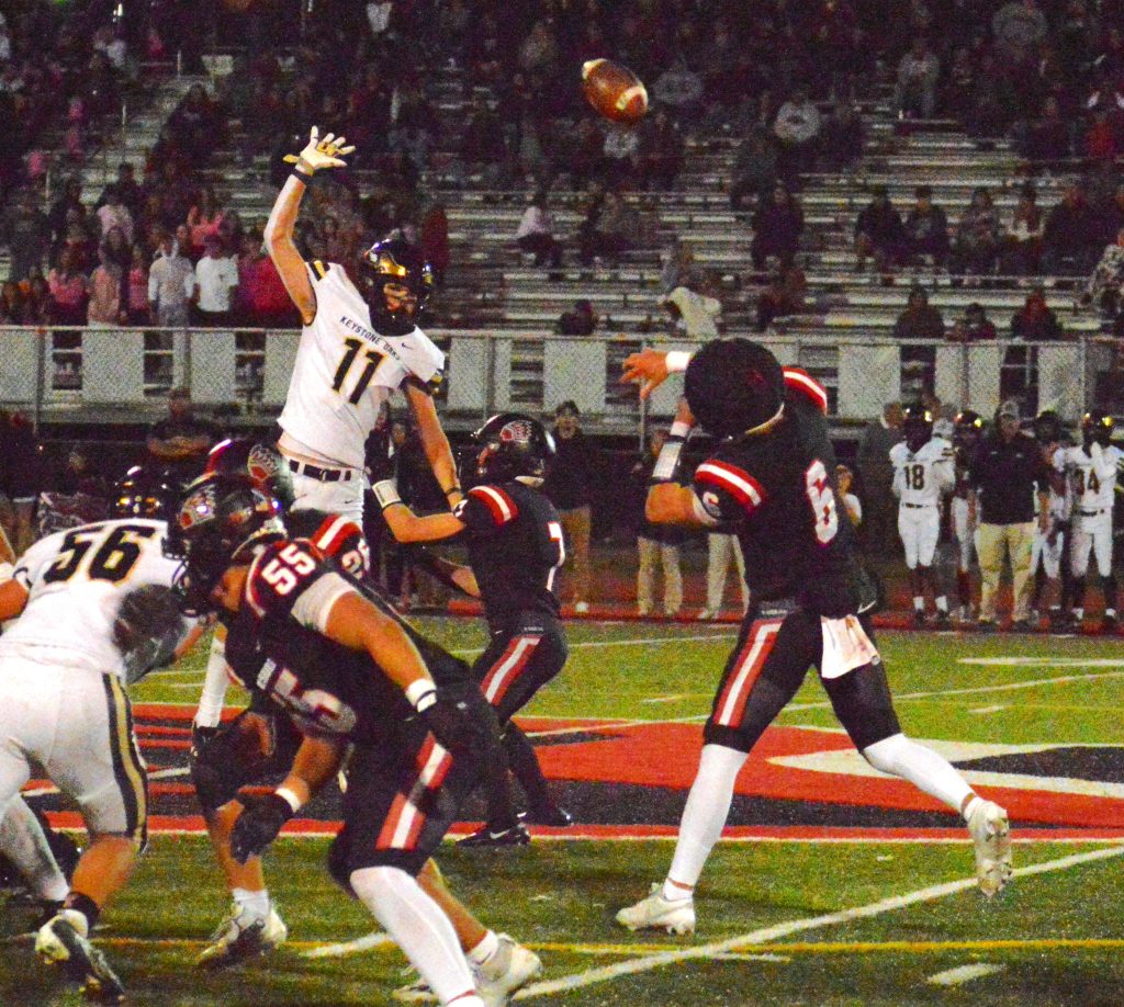 The Raiders again moved the sticks twice on their next possession but a holding penalty and a 7-yard sack of Stephenson left the hosts with a fourth and 26 from the Keystone Oaks 36 and a disguised punt by Stephenson just snuck into the end zone for a touchback.